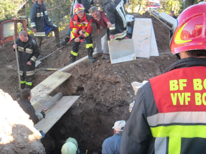 Am Freitag, den 31.10.2014 gegen 14.00 Uhr ist diese Berufsfeuerwehr zu einem Arbeitsunfall in Eppan/Berg alarmiert worden. Ein Arbeiter war dabei in einem ca.4m tiefen Graben dabei Leitungen zu verlegen als der Graben in sich zusammenstürzte. Dabei wurde der Eppaner von den Erdmassen begraben: nur mehr ein kleiner Teil seines Kopfes blieb frei. Nachdem anwesende Arbeiter Alarm geschlagen haben konnte er von den herbeigeeilten Feuerwehrmännern nach ca. 45 min befreit werden. Er trug lediglich leichte Verletztungen davon.