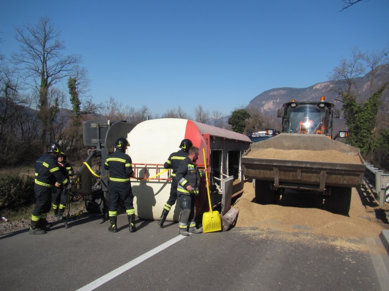 Gegen 13:10 ca. wurde diese Berufsfeuerwehr zu einem weiteren LKW Unfall nach Auer gerufen. Ein mit Tierfutter beladener Hängerzug fuhr in Richtung Montan als er kurz nach Auer in einer Kurve aus ungeklärter Ursache umkippte. Dabei wurde der Anhänger beschädigt und ein Teil des Ladegutes geriet auf die Strasse. Zusammen mit der Freiwilligen Feuerwehr Auer und dem Strassendienst wurde der Hänger auf die Räder gestellt und die Strasse gesäubert.