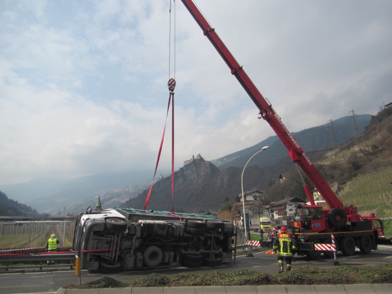 Foto BF BZ VVF BZHeute gegen 09.45 Uhr ca. ist ein mit gepressten Heuballen beladener LKW beim Einbiegen von der Staatstrasse SS12 auf die Landesstrasse ins Grödental aus noch nicht bekannten Ursachen seitlich umgestürzt. Der Fahrer blieb dabei unverletzt. Die alarmierte Freiwillige Feuerwehr Klausen verständigte die Kranmannschaft dieser Berufsfeuerwehr. Mit einem schweren Kran und einem Rüstwagen wurde der LKW samt Ladung wieder auf die Räder gestellt und so konnte gegen 12.00 Uhr die Straße wieder frei gegeben werden. Durch örtliche Umleitungen bildeten sich keine Staus. Am Einsatzort waren neben der Freiwilligen Feuerwehren Klausen und dieser Berufsfeuerwehr auch je eine Streife der Carabinieri, der Strassenpolizei und der Gemeindepolizei von Klausen.