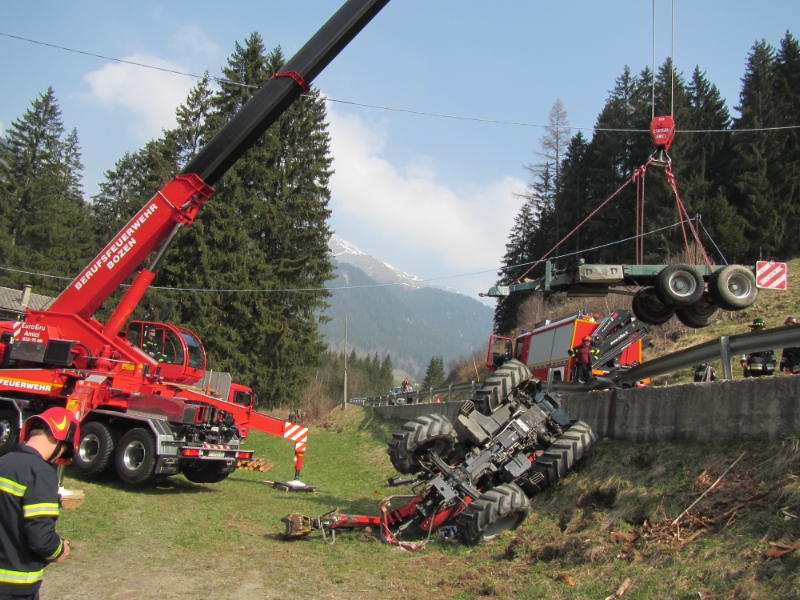 Der Fahrer hat sich dabei leicht verletzt und wurde vom Weissen Kreuz ins Krankenhaus eingeliefert. Die alarmierte Freiwillige Feuerwehr Astfeld verständigte die Kranmannschaft dieser Berufsfeuerwehr. Mit einem schweren Kran und dem Rüstwagen wurde der Traktor samt Anhänger geborgen und so konnte gegen 11.00 Uhr die Straße wieder frei gegeben werden. Durch örtliche Umleitungen bildeten sich keine Staus. Am Einsatzort waren neben der Freiwilligen Feuerwehr Astfeld und dieser Berufsfeuerwehr auch eine Streife der Carabinieri und der Strassendienst.