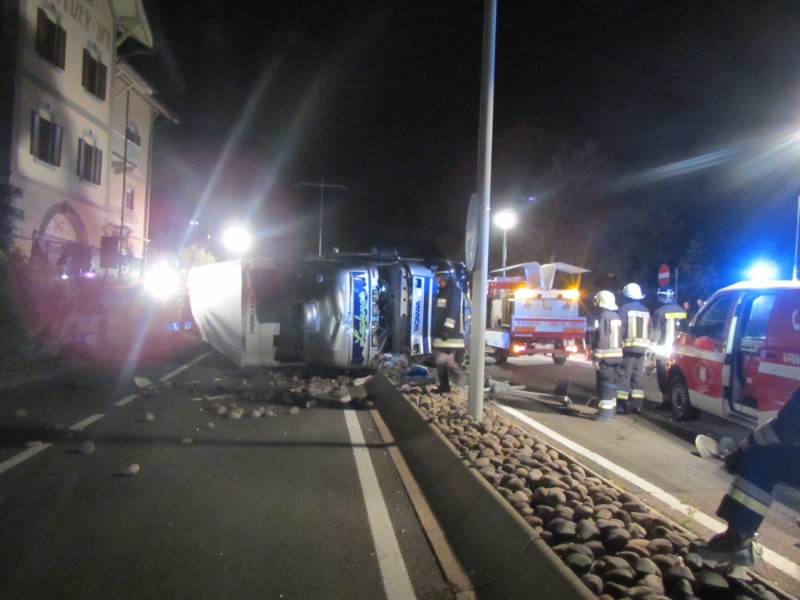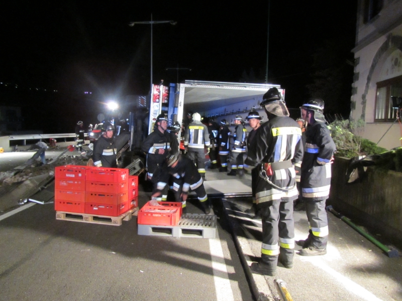 Am Dienstag, den 22.09.2015 wurde um 00.21 Uhr die Kranmannschaft dieser Berufsfeuerwehr als Unterstützung der örtlichen Feuerwehren zu einem LKW Unfall auf die MEBO nach Algund von der Landesnotrufzentrale alarmiert. Dort war ein LKW mit Fleisch beladen auf der Höhe des Gasthofes Etschtalerhof seitlich umgestürzt. Der Fahrer wurde nur leicht verletzt.