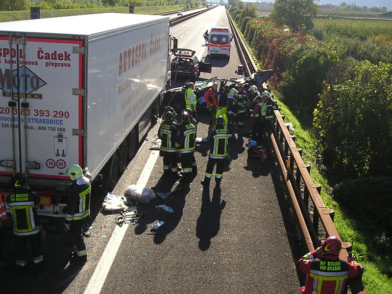 Zum Unfall kam es am Dienstag, den 27.10.2015 um 13.30 Uhr rund zweieinhalb Kilometer unterhalb der Einfahrt Neumarkt. "Ein Wagenlenker ist dabei mit seinem Pkw auf einen Sattelschlepper aufgefahren", berichtet Harald Schwarz, Offizier der Bozner Berufsfeuerwehr.