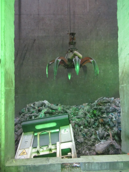 Ein Container fällt in die Müllmulde des Verbrennungsofens
