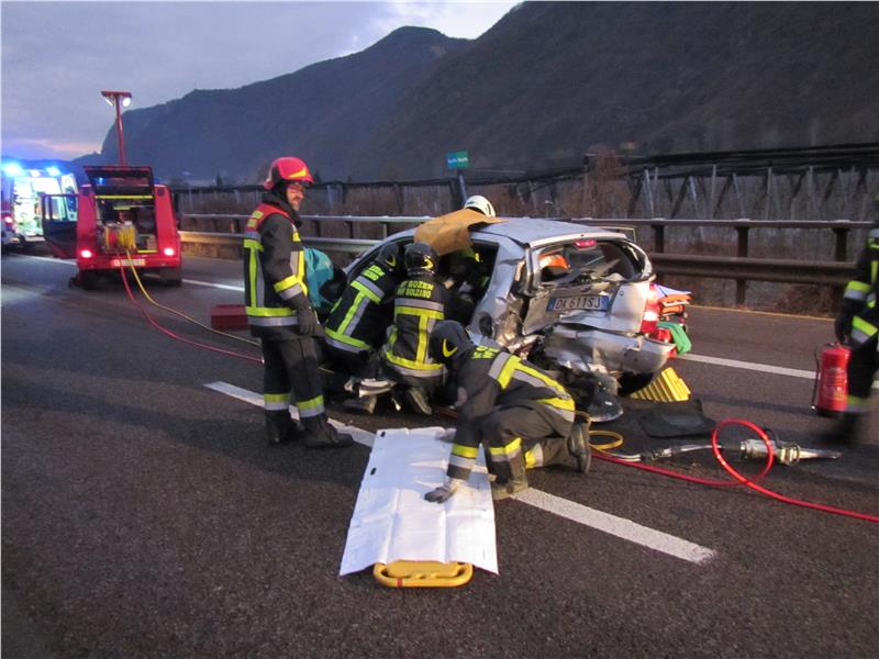 Heute Morgen kurz nach 7:00 Uhr wurde die Berufsfeuerwehr Bozen zu einem Verkehrsunfall auf die Autobahn gerufen. Auf der Südspur bei km 90,6 war es zu einem Verkehrsunfall gekommen. Am Unfall waren zwei Fahrzeuge verwickelt. Zur Rettung eines Verletzten mußte hydraulisches Bergegerät eingesetzt werden. Während des Einsatzes wurde die Südspur kurzzeitig komplett für den Verkehr gesperrt. Aufgrund des Unfalles bildet sich sofort ein kilometerlanger Rückstau auf der Autobahn. Neben dieser Berufsfeuerwehr standen auch der Rettungsdienst, die Autobahnpolizei und der Verkehrsdienst der Autobahn im Einsatz.