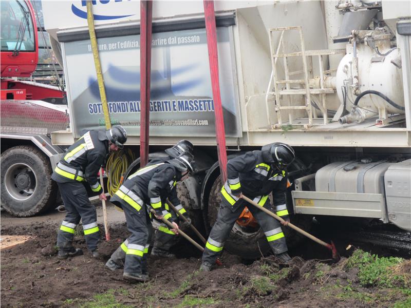 Das Fahrzeug ist bei einer Baustellenzufahrt in einer Kurve mit den Hinterrädern in das, durch die heftigen Regenfälle der letzten Tage aufgeweichte Erdreich geraten und dabei eingesunken. Das für die Herstellung von Industrieböden verwendete Fahrzeug befand sich in einer Schräglage und drohte umzustürzen.