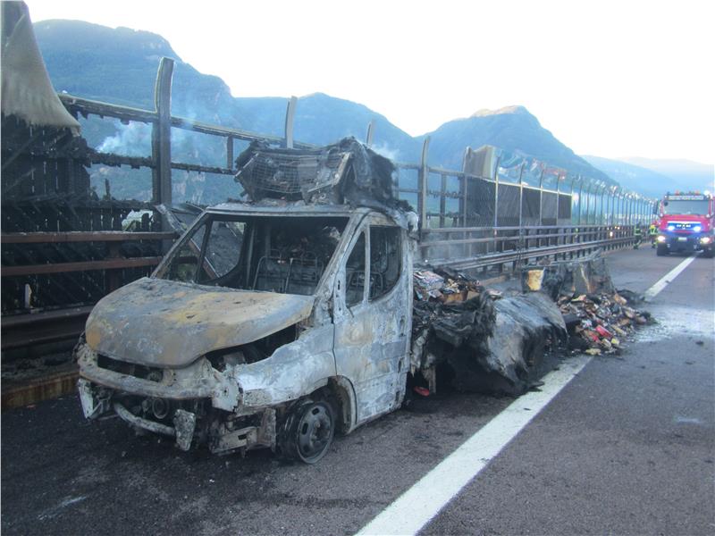 Gegen 05:40 Uhr des 19.08.2020 wurde die Berufsfeuerwehr von Bozen zusammen mit der Freiwilligen Feuerwehr von Neumarkt auf die Nordspur der Autobahn A22 Höhe km 90 gerufen, nachdem ein Lieferwagen in Brand geraten war. Trotz des schnellen Eingreifens brannte das Fahrzeug völlig aus. Die Flammen griffen auch auf die Schallschutzverbauung der Autobahn über und beschädigten diese. Verletzt wurde niemand. Die Ursache des Brandes ist auf einen technischen Defekt zurückzuführen. Im Einsatz standen neben den genannten Feuerwehren die Autobahnpolizei und Straßenmeisterei A22.