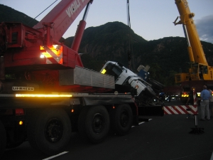 FOTO BF VVF BZAm Dienstag, den 27.07.2004 gegen 18.00 Uhr ist ein Spezialtransport - fahrzeug, das auf der Brennerstaatstrasse bei Branzoll von Süden kommend Richtung Bozen unterwegs war, von der Strasse abgekommen. Der LKW hatte zwei Spannbetonplatten geladen. Womöglich wegen eines Defektes an den hinteren, lenkbaren Achsen des Anhängers kam der Anhänger von der Fahrbahn ab und rutschte in den Strassengraben. Eine Betonplatte, mit einem Gewicht von 22 Tonnen jeweils, landete in einem Weinacker, während die zweite Platte teilweise auf dem Hänger blieb und durch ihr grosses Gewicht die Zugmaschine umrieß und diese halb in der Luft quer über die Fahrbahn zum Stehen kam. Gemeinsam mit einem 140 Tonnen-Kran einer privaten Kranfirma hob der grosse Kran der Berufsfeuerwehr Bozen die Betonplatte vom LKW und anschließend wurde der LKW samt Hänger wieder behutsam auf die Räder gestellt, sodass das Spezialfahrzeug ohne grosse Schäden die Staatsstrasse verlassen konnte und selbst bis zur nächsten Ausweichstelle fuhr. Die Strasse blieb wegen der aufwendigen Bergungsarbeiten bis um 22.00 Uhr komplett für den Verkehr geschlossen, wobei der Leichtverkehr direkt durch Branzoll umgeleitet werden konnte und der Schwerverkehr über die Autobahn umgeleitet wurde, sodass sich die Verkehrsbehinderungen in Grenzen hielten. Am Einsatzort waren weiters auch die Freiwillige Feuerwehr von Branzoll, die Carabinieri von Branzoll und der Strassendienst des Landes.