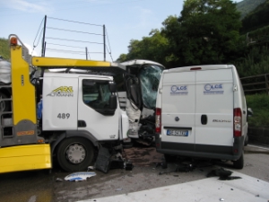 Die beiden Fahrzeuge prallten zusammen, der Reisebus wurde gegen die Begrenzungsmauer gedrückt. Ein Lieferwagen des Typs Ducato, der zur selben Zeit auf die Autobahn auffahren wollte, wurde dabei ebenfalls in den Unfall verwickelt.