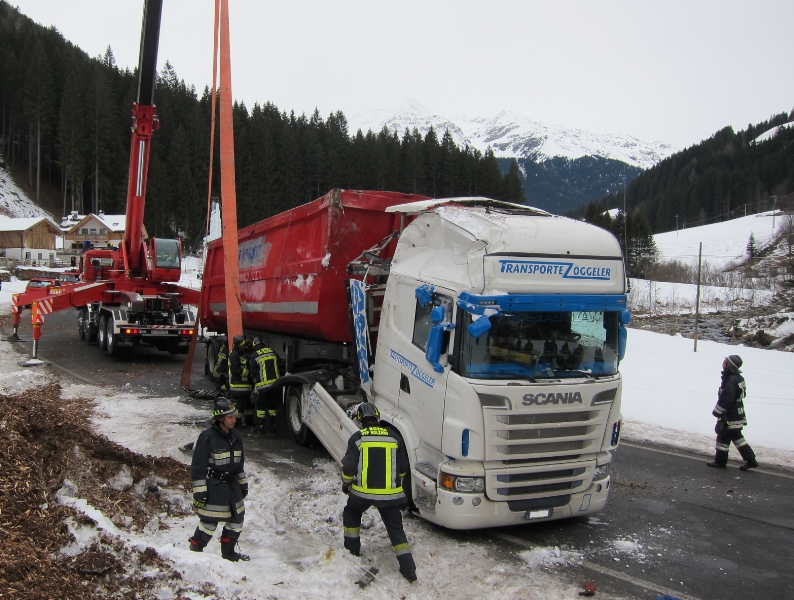 Am Freitag, den 01.02.2013 am Vormittag gegen 11 Uhr kam es auf der Sarntaler Staatsstraße zwischen Astfeld und Pens, auf der Höhe des Restaurants Trappmannhüttl, zu einem LKW Unfall.