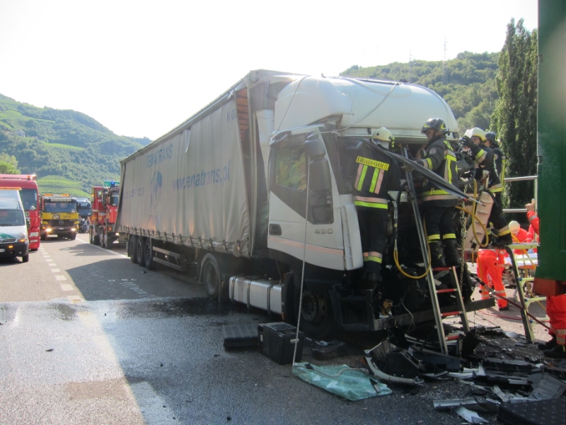 Zeitgleich zu diesem Einsatz wurde eine zweite Mannschaft der Berufsfeuerwehr zu einem schweren LkW-Unfall auf die A22 gerufen. Auf der Südspur bei km 79 waren zwei Sattelzüge in einem Auffahrunfall verwickelt. Im zweiten LkW war der Fahrer in seiner Kabine eingeklemmt. Mit dem Kran wurde das Fahrzeug zurückgezogen und mittels schwerem Bergerät konnte dann der Fahrer befreit werden. Während des Einsatzes wurde die Südspur der Autobahn komplett gesperrt. Auch hier bildeten sich lange Staus. Im Einsatz standen neben der Berufsfeuerwehr Bozen auch die Freiwillige Feuerwehr Kardaun, der Rettungsdienst, die Straßenpolizei, Mitarbeiter der Autobahn und der Abschleppdienst.