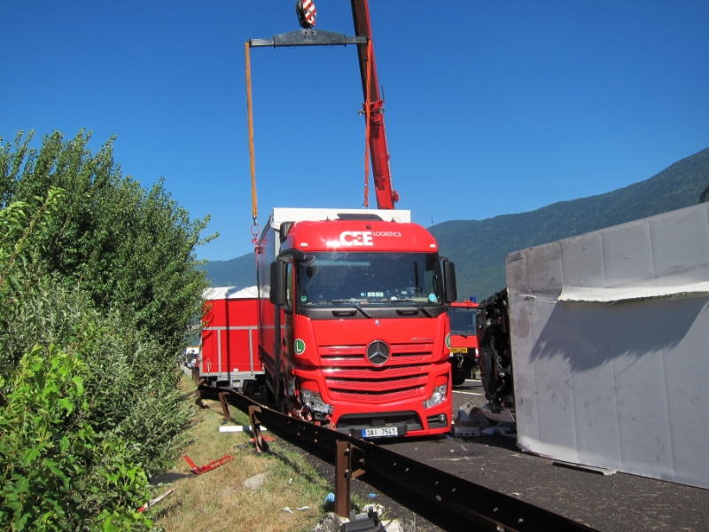 Ein LKW lag seitlich quer auf der Südspür, ein LKW war auf der Notspur und ein weiterer PKW war auf den LKW aufgefahren. Alle Insassen wurden dabei nur leicht verletzt. Die Autobahn war für ca. eine Stunde komplett in Richtung Süden gesperrt.