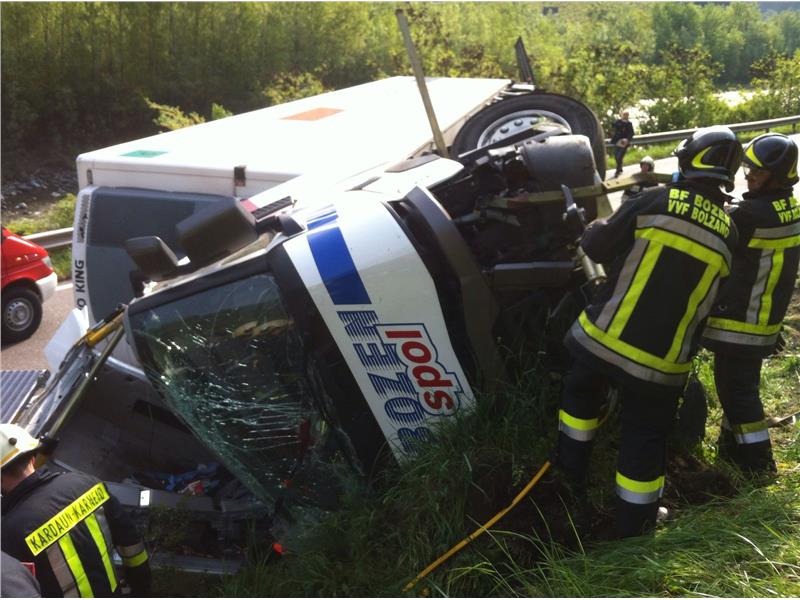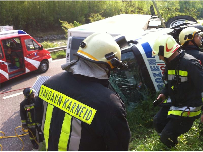 Am Freitag, den 22. April 2016 sind am frühen Vormittag der Landesnotrufzentrale innerhalb 20 Minuten zwei LKW Unfälle gemeldet worden. Diese Berufsfeuerwehr rückte laut Ausrückeordnung mit zwei Kranfahrzeugen aus. Ein LKW ist nördlich von Kardaun auf der Staatsstraße seitlich umgekippt und hat die Staatstraße völlig blockiert. Der Fahrer wurde von der Feuerwehr aus der Kabine befreit und dem Rettungsdienst übergeben. Er wurde mittelschwer verletzt. Der Beifahrer wurde ebenfalls ins Krankenhaus gebarcht. Die Fleischladung muß jetzt nach der Genehmigung des Veterinärsarztes umgeladen werden und dann kann erst der LKW mittels Kranfahrzeuge aufgestellt werden. Die Staatstraße wird noch einige Stunden für die Bergungsarbeiten gesperrt bleiben.