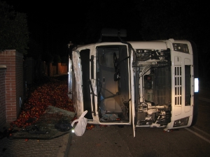 Ribaltamento di autoarticolato con carico di pesche nella Via A.Kuperion a Merano.