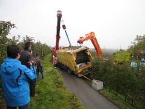 Un camion per il recupero dei rifiuti transitando sulla ripida strada di Scena finiva sulla banchina cedevole sprofondando nel terreno morbido. Il camion, pesante 12 tonnellate, minacciava di rovesciarsi lungo una scarpata alta diversi metri. I vigili del fuoco di Scena provvedevano a mettere in sicurezza l'automezzo fino all'arrivo del Corpo Permanente di Bolzano. Solamente dopo un accurato lavoro di costruzione di fondamenta si poteva mettere la grù in condizione di lavorare sulla stretta strada in modo da poter eseguire, insieme ad un escavatore di una ditta privata, il recupero del mezzo incidentato rimettendolo sulla sede stradale.