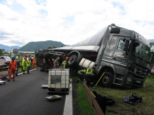 Venerdí 24 giugno 2011 alle ore 08.00 circa, un autotreno che trasportava barre di alluminio, entrato al casello di Bolzano Sud, si apprestava ad entrare in autostrada sulla corsia Nord, ma si é rovesciato su un fianco mentre percorreva la corsia di ingresso. Secondo la polizia Stradale, la causa é da attribuirsi ad uno spostamento improvviso del carico. Il conducente di nazionalitá slovacca é rimasto illeso. Si é peró subito formata una lunga coda, anche a causa dell'intenso traffico del week end. La squadra gru del Corpo Permanente dei Vigili del Fuoco di Bolzano, é stata allertata dalla Centrale Provinciale di Emergenza, e come primo compito ha provveduto ad arginare la perdita di gasolio causata dalla rottura del serbatoio del mezzo pesante. In seguito il carico di alluminio rovesciato é stato spostato sia manualmente che con l'aiuto di una pala gommata su un altro automezzo giunto sul posto. Una volta recuperato e trasferito il carico, l'autotreno é stato raddrizzato con l'ausilio della gru e successivamente trainato via. Vista la perdita di carburante nel terreno circostante é stato necessario fare intervenire un tecnico dell'Agenzia Provinciale per l'Ambiente, il quale ha provveduto a contattare un ditta specializzata che ha rimosso il terreno inquinato e bonificato la zona. Sul posto sono intervenuti anche i Vigili del Fuoco Volontari di Bolzano, la Polizia Stradale ed il Servizio sanitario. L'ingresso autostradale in direzione Nord é rimasto chiuso fino alle ore 12.00 circa.
