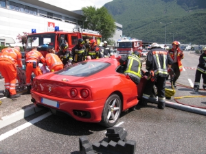 Oggi, domenica 29 luglio 2012, i Vigili del Fuoco del Corpo Permanente di Bolzano sono stati allertati dalla Centrale Provinciale Emergenza per un grave incidente stradale in via Einstein a Bolzano. Due persone alla guida di una Ferrari 360 Modena, percorrendo via Einstein, perdevano il controllo della stessa andando a sbattere contro un palo della luce. La corsa della Ferrari terminava circa 30 metri più avanti sulla corsia opposta. A causa del violentissimo urto, sia l'autista che il passeggero risultavano feriti. All'arrivo dei Vigili del Fuoco, l'autista sedeva fuori dall'auto mentre il passeggero era incastrato all'interno della vettura. Per liberarlo è stato necessario utilizzare le pinze idrauliche. Con l'aiuto del Servizio Sanitario il passeggero, che risulta essere gravemente ferito è stato liberato e portato all'ospedale di Bolzano. Il mezzo risulta completamente distrutto.