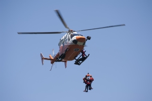 Due soccorritori acquatici del Corpo Permanente sono stati prelevati in caserma dall’elicottero Pelikan 1 e si sono recati immediatamente sul posto dell´avvistamento a Lana.