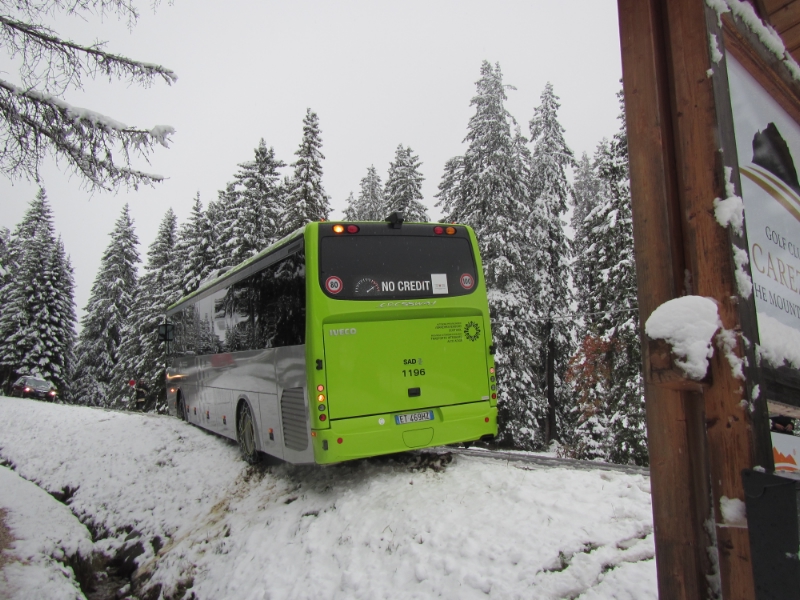 Oggi verso le ore 14.30 nella zona di Passo Carezza durante una manovra per far passare un' autoveicolo che viaggiava in direzione opposta un BUS di linea della SAD é uscito di strada e a causa della prima neve caduta oggi non é piú stato in grado di proseguire.