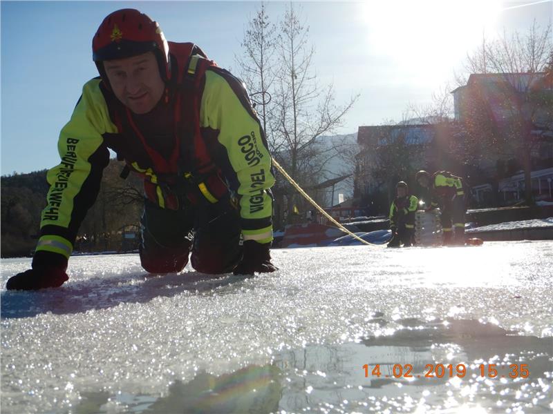 Per essere preparati a questi incarichi speciali speciali, il programma di allenamento prevede regolari esercitazioni per il soccorso su superfici ghiacciate.Le condizioni di potenziale pericolo si presentano durante le anomale miti giornate invernali e all'approssimarsi della primavera, dove si verifica la diminuzione dello spessore del ghiaccio. In questi giorni, presso il lago grande di Monticolo, il Corpo Permanente dei VVF Bolzano, svolge queste esercitazioni.