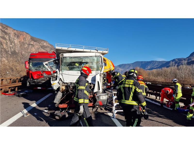Alle 10:15 i Vigili del Fuoco del Corpo Permanente di Bolzano sono stati chiamati per un incidente stradale sull'autostrada del Brennero A22 al Km 96 - corsia sud. Quattro autocarri sono stati coinvolti nel tamponamento, con un conducente ancora intrappolato nel proprio veicolo all'arrivo sul posto della Prima squadra del Corpo Permanente.