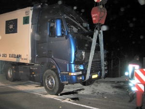 Foto BFBZUn grave incidente stradale si é verificato alle ore 23:00 del 07.04.2005 sulla strada statale della val venosta all´altezza di Lasa. Un autotreno si è rovesciato incastrando pesantemente l´autista. Difficili e lunghe operazioni con apparecchiature idrauliche hanno consentito ai corpi dei vigili volontari di Lasa e Oris l´estrazione dell´autista, il quale è stato poi assistito dalla Croce Bianca di Silandro. L´autista che ha riportato ferite di media entitá è stato ricoverato all´ospedale di Silandro. Per consentire il recupero dell´automezzo è stato necessario scaricare a mano l´intero rimorchio frigo. Per mezzo dei due potenti Gru del Corpo Permanente dei Vigili del Fuoco di Bolzano è stato possibile riportare il camion in carreggiata e quindi trainarlo fino al vicino parcheggio. Alle ore 5.00 dopo circa sei ore di intense operazioni di recupero si è potuto ripaprire il traffico sulla strada statale.
