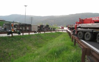 Foto BFBZSabato, 3 Aprile 2004 verso le ore 17:00, un camion con rimorchio si é rovesciato su di un fianco nelle vicinanze del casello autostradale di Bolzano Sud.