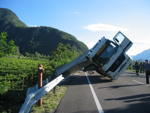 FOTO BF VVF BZMartedí, 27.07.2004 alle ore 18.00, é uscito di strada nei pressi di Bronzolo un camion con rimorchio proveniente da sud e diretto a Bolzano. Il camion trasportava due lastre di calecestruzzo precompresso. Probabilmente per un guasto tecnico ad una delle assi posteriori del rimorchio, il mezzo é uscito di strada, finendo nel fossato. Una lastra del peso di 22 tonnelate finí in una vigna, mentre la seconda lastra rimase parzialmente sul rimorchio. Il suo enorme peso rovesció il mezzo che si fermó di traverso sulla careggiata, parzialmente sospeso in aria.
