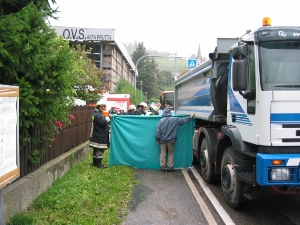 FOTO BFBZ - VVFBZNel pomeriggio del 11.10.2004 i Vigili del Fuoco del Corpo Permanente di Bolzano sono intervenuti a Frangarto per un grave incidente stradale. Una giovane donna è stata travolta da un camion rimanendo incastrata sotto l'asse posteriore. Mentre veniva chiamato sul posto il medico d'emergenza della Croce Bianca per constatarne il decesso, i Vigili del Fuoco del Corpo Permanente di Bolzano coadiuvati dai Vigili del Fuoco Volontari di Frangarto hanno estratto la donna con l'ausilio dei cuscini pneumatici. Sul posto sono intervenuti anche i Carabinieri di Appiano.