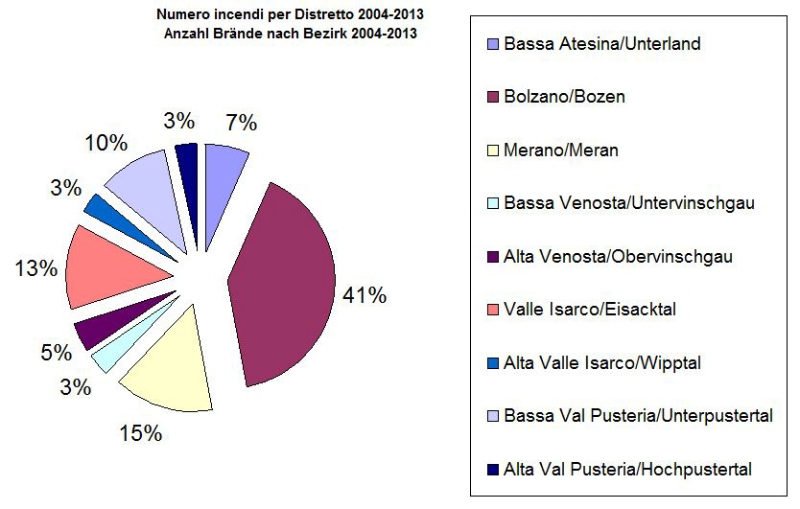 L'associazione provinciale dei Vigili del Fuoco Volontari ha iniziato nel 2004 a rilevare gli interventi e a riportarli in una banca dati elettronica, dal 2005 sono stati registrati tutti gli interventi sul territorio e quindi si è creata la possibilità di effettuare un'analisi statistica degli incendi con i dati raccolti. Il numero totale degli incendi è aumentato lentamente ma costantemente passando da circa 480 nel 2005 a circa 550 nel 2013. Nella città di Bolzano (somma dei dati forniti dal Corpo permanente e dai Vigili del Fuoco volontari) il totale degli incendio è leggermente in decrescita: si passa dai circa 170 del 2005 ai 130 del 2013. La maggior parte dei casi occorre negli edifici residenziali (da 200 a 250 all'anno). Gli incendi in alberghi ammontano al massimo a 50 casi nel corso dell'anno; altre attività (industria, scuole, ospedali, ecc) sono soggette ad un minor numero di tali eventi. La prospettiva cambia non appena gli incendi sono considerati in funzione dell'attività svolta nell'edificio in cui si sono verificati. Nel 2013, il 17 per cento degli ospedali e case di cura (!) è stato colpito da un incendio, per gli edifici scolastici è il 3 per cento mentre tale percentuale per tutte le altre attività è di circa 1 o anche meno. Per i Vigili del fuoco volontari è senz'altro interessante la suddivisione per distretto e per comune. Il numero degli incendi naturalmente è più alto nelle località più grandi. per motivi di privacy non è stato possibile effettuare statistiche sui danni dovuti agli incendi. A partire dal 2014 l'ufficio si sta impegnando a raccogliere una varietà di dati più completa. La statistica è stata elaborata dall'Ufficio prevenzione Incendi in collaborazione con l'Associazione provinciale dei Vigili del fuoco volontari ed il Corpo permanente dei vigili del fuoco. Tutti i diagrammi saranno disponibili nel sito della Ripartizione protezione antincendio e civile http://www.provincia.bz.it/protezione-civile/antincendio/prevenzione-incendi.asp