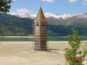 La torre del campanile che emerge dal lago di Resia risale al XIV secolo, ultima testimonianza rimasta dei vecchi paesi di Curon, Resia e San Valentino, scomparsi nel 1950 per fare posto alla costruzione dell'enorme diga artificiale. Il campanile nel lago, diventato simbolo della zona, è stato ora restaurato dagli esperti della Ripartizione provinciale Edilizia e servizio tecnico (Ufficio manutenzione opere edili) e della Ripartizione Beni culturali, che nel giro di due mesi sono intervenuti con successo sulla statica e sulle crepe verticali individuate agli angoli delle facciate nord e nord-est, imputabili all'acqua penetrata nelle piccole fessure e alle successive gelate invernali. Per permettere l'operazione, a maggio il livello del lago artificiale è stato sensibilmente abbassato e ieri sera (9 luglio), a conclusione dei lavori, la diga è stata nuovamente riempita di acqua.