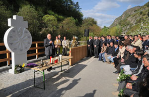 La cerimonia si è conclusa con l'inaugurazione e la benedizione della stele commemorativa, realizzata in marmo di Lasa, che riporta i nomi di tutte le nove vittime dell'incidente del 12 aprile 2010. L'opera, disegnata dallo scultore Karl Grasser e realizzata da Josef Mayr, è stata installata lungo la pista ciclabile posta sulla sponda opposta del fiume Adige rispetto a quella dove scorrono i binari che, esattamente un anno fa, furono investiti da una frana di fango e detriti.