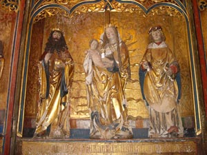 Si tratta di statue lignee della scuola tardogotica dello scultore svevo Ivo Strigel (1431-1516) che raffigurano Maria col Bambino tra i patroni diocesani di Coira Luzius e Florinus. Le tre figure fanno parte di un altare originario probabilmente del Canton Grigioni giunto nell'Alta Val Venosta probabilmente in concomitanza con la Riforma. L'altare risale al 1514; le cifre dell'anno sono riportate sul retro dell'altare stesso. I dipinti sul retro altare e sulle pale sono del pittore Hans Goldschmid, attivo presso la botega di Strigel a Memmingen (D).