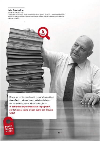 Curiosamente, nel numero in distribuzione in questi giorni, il presidente Durnwalder è anche l'unico membro della Giunta provinciale ad avere "diritto di parola" all'interno della sua prefazione. Le considerazioni degli altri assessori, infatti, sono affidate ad un progetto fotografico. Inoltre, chi volesse ripercorrere i passaggi più importanti degli ultimi 5 anni di attività dell'esecutivo altoatesino in maniera "giocosa", potrà sbizzarrirsi nelle due pagine centrali del numero di "Provincia Autonoma".