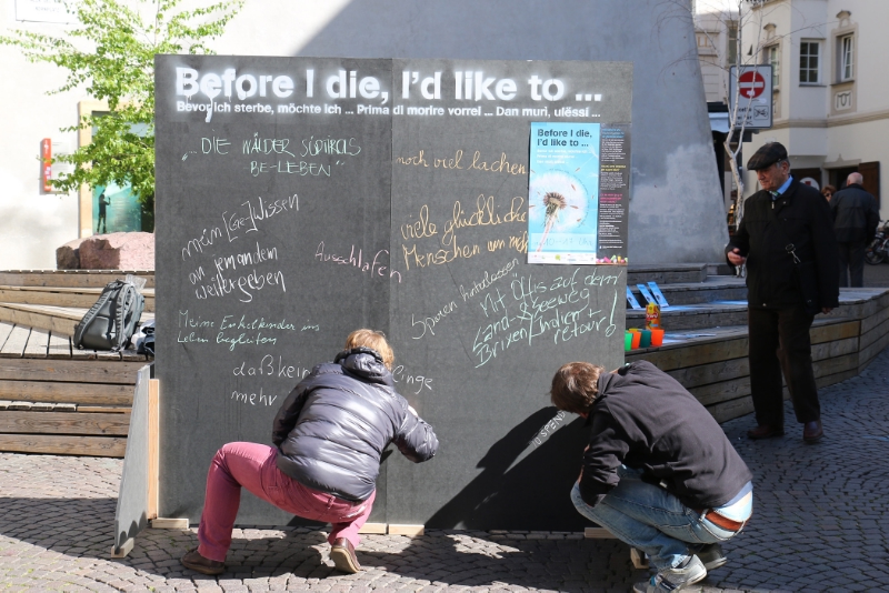 Il progetto si svolge in occasione dell'iniziativa "Verso una cittadinanza attiva". Lavagne con la scritta "Prima di morire vorrei..." saranno installate in diverse località della provincia di Bolzano (nei giorni 23.04-9.05), a Terlano presso la Stazione, a Lagundo in Piazza Hans Gamper 1, a Riffiano in Piazzetta Fontana, a Malles in Stazione, a Ortisei al Circolo Lia Mostra d'Ert, a San Martino in Badia al Museo Ladino, all'Accademia Cusano, a Novacella presso il Centro Convegni, a Nalles presso il Centro Convegni, a Merano in via Ortwein 6, presso la Biblioteca di Dobbiaco (23.04-16.05).