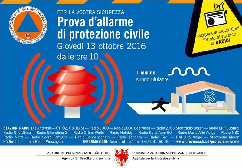 Tutte le informazioni sono disponibili anche online sul sito della Protezione civile a questo link: www.provincia.bz.it/protezione-civile/allarme/sirena-sistema-allertamento-popolazione.asp