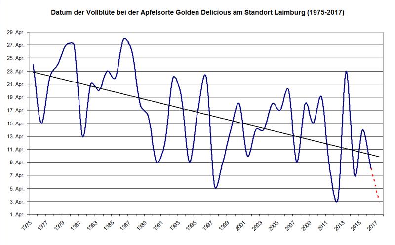 Nei frutteti di Vadena nei pressi del Centro Laimburg quest'anno si attende la fioritura massima, con almeno il 50 per cento dei fiori aperti, attorno a 3 e 4 aprile, circa 14 giorni prima della media sul lungo periodo riferita agli ultimi 42 anni (ovvero il 17 aprile). L'evento è sorprendente dopo l'inverno 2016/17 piuttosto freddo.