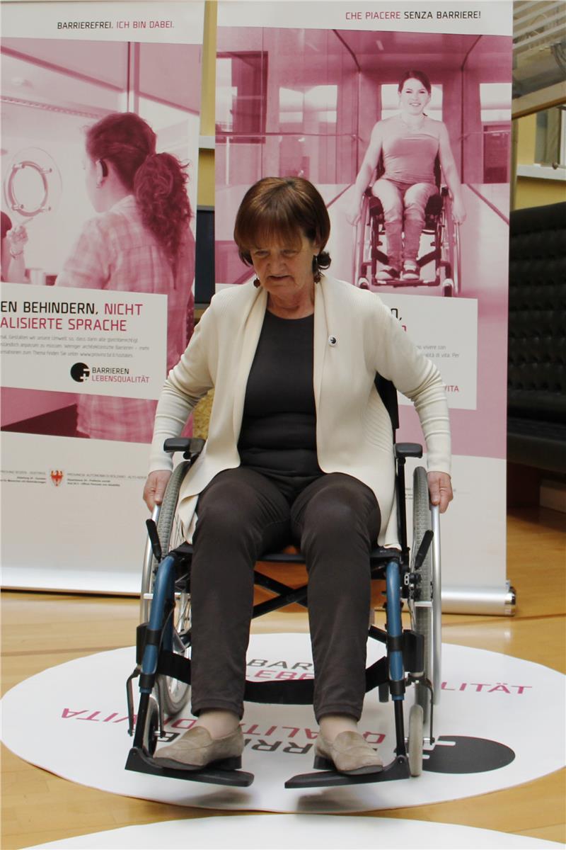 Al termine della conferenza stampa sia il preside Arno Kompatscher che l’assessora Martha Stocker hanno esemplificato l’uso del tappeto utilizzando rispettivamente una sedia a rotelle ed una carrozzina per bambini.