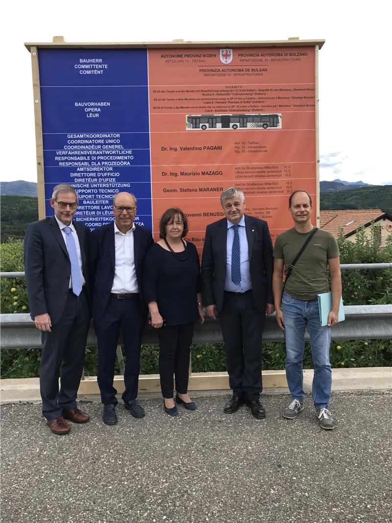 nella foto da sx: il vicesindaco di Caldaro, Werner Atz, il direttore di dipartimento Valentino Pagani, la sindaca di Caldaro Gertrud Benin Bernard, l'assessore Florian Mussner e Davide Ziller, dell'Ufficio tecnico strade nord-est