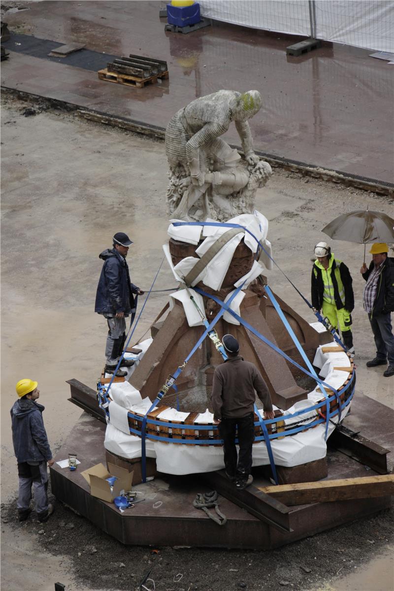 Sono cominciati questa mattina (12 aprile) e sono terminati nel tardo pomeriggio in piazza Magnago i lavori per lo spostamento della statua di Re Laurino dall’attuale collocazione a quella temporanea nel parco di piazza Stazione. "Si tratta di un un’operazione delicata – spiega Irene Braito dell'Ufficio edilizia est, responsabile del progetto di riqualificazione della piazza – anche alla luce dello stato di conservazione del manufatto che presenta già numerose crepe". La fontana e il gruppo scultoreo, composti in tutto da una decina di pezzi, pesano tra le 16 e le 18 tonnellate. I tecnici della ditta specializzata Südtirol Stein, in accordo con l’Ufficio beni architettonici e artistici, hanno elaborato un piano per lo spostamento che prevede di "imballare" la struttura per renderne possibile dapprima il sollevamento tramite delle cinghie e quindi il trasporto.