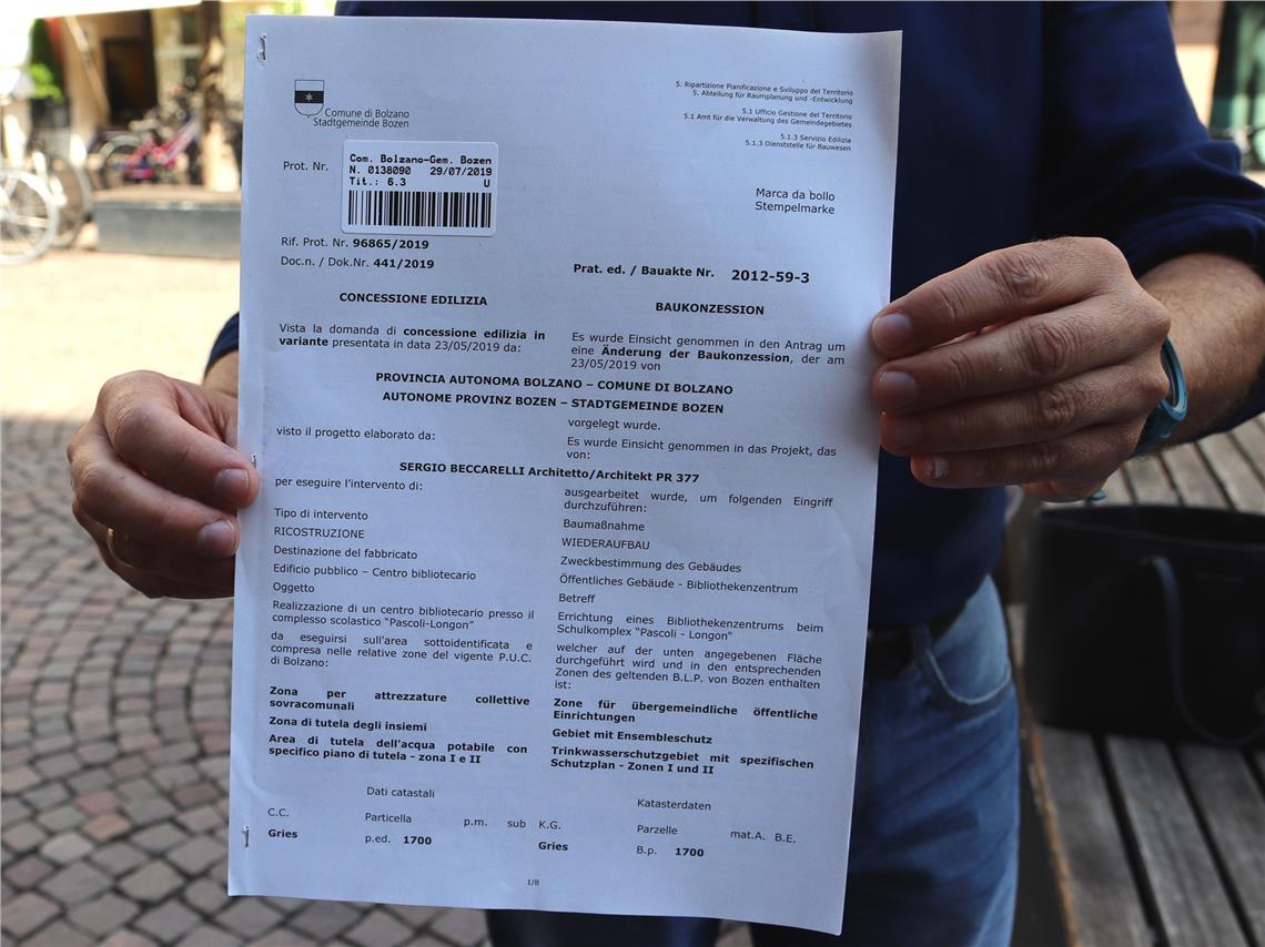 La concessione edilizia rilasciata dal Comune di Bolzano per la costruzione del futuro Polo bibliotecario, datata 29 luglio 2019, è stata consegnata questa mattina (1° agosto), all'assessore provinciale all'edilizia pubblica Massimo Bessone. "Il rilascio della concessione edilizia costituisce un passo formale importante per proseguire con la progettazione del Polo bibliotecario. Entro l'autunno 2019 potrà così essere predisposto e approvato il progetto definitivo per quest'opera di rilievo per la città di Bolzano e per l'Alto Adige", afferma Bessone.