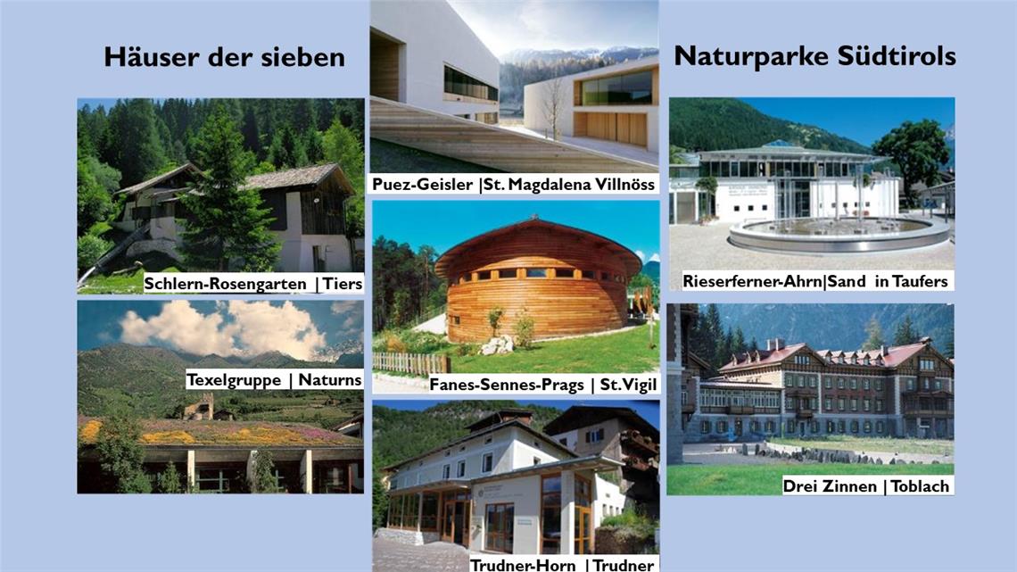 I centri visite dei sette parchi naturali altoatesini Monte Corno, Gruppo di Tessa, Tre Cime, Puez-Odle, Fanes-Senes-Braies, Vedrette di Ries-Aurina e Sciliar-Catinaccio, ogni anno propongono un’offerta variegata di iniziative ai visitatori. Accanto alle mostre permanenti, vi sono numerose mostre temporanee, nonché escursioni giornaliere e conferenze e proiezioni serali. L’obiettivo, fornire impressioni sull’affascinante mondo dei parchi naturali e sulle peculiarità dei loro paesaggi, dei monti e della natura nelle aree protette.