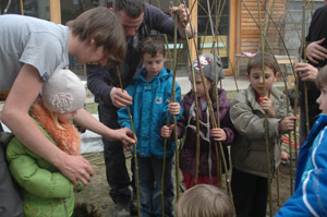 Schüler der Klasse 1C der Gärtner und Floristen im ersten Ausbildungsjahr errichteten zudem in einem Kindergarten in Meran ein Weidenhaus. Die Weiden für dieses Projekt wurden von Max Niedermayr und Christine Flor aus Montiggl zur Verfügung gestellt und an zwei Praxisnachmittagen von den Schülern selbst geschnitten. Die Projektleitung oblag Andrea Schulz von der Fachschule Laimburg.