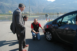 In den anschließenden Tests auf dem Gelände des Safety Parks konnten sich die Teilnehmer unter Anleitung der Instruktoren selbst vom Verhalten der Fahrzeuge bei unterschiedlicher Bereifung und bei unterschiedlichen Straßenverhältnissen überzeugen. Dazu gab es nützliche Tipps zum Thema Sommerreifen-Winterreifen, Mischbereifung, gesetzliche Bestimmungen, Reifen-Kennzeichnung, richtiger Luftdruck, Reifenprofil, richtige Lagerung und viel Wissenswertes mehr.