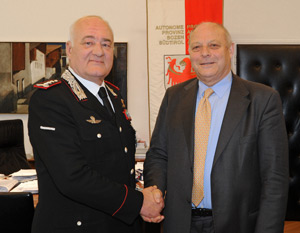 LPA - Der Kommandant der Carabinieri-Region Nordost, General Massimo Iadanza, hat sich heute (1. April) bei Landeshauptmann Luis Durnwalder in seinem Büro im Palais Widmann in Bozen eingefunden. Diskutiert wurde vor allem über die Unterbringung der Carabinieri und die Zusammenarbeit im Bereich der öffentlichen Sicherheit und des Zivilschutzes.