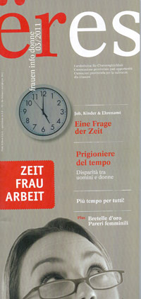 Der Kampf gegen die Zeit, ist im ersten Teil des Informationsheftes nachzulesen, ist zum festen Bestandteil moderner Frauenleben geworden - damit sich das ändert, braucht es ein Umdenken und die Mithilfe aller. Laut einer statistischen Erhebung arbeiten nämlich Frauen im Durchschnitt täglich vier Stunden und dreißig Minuten im eigenen Haushalt - Zeit, die ihnen im Vergleich mit den Männern fehlt, um Geld zu verdienen oder Netzwerke zu knüpfen, Freundschaften oder Hobbies zu pflegen. Initiativen und Pilotprojekte in Meran, die beispielhaft in der neuesten ëres-Ausgabe beschrieben werden, sollen dem entgegenwirken. Sechs Frauen, darunter die Landesbäuerin, eine Unternehmerin, eine Steuerberaterin, führen aus, wie ihnen der Spagat zwischen häuslicher und bezahlter Arbeit gelingt.