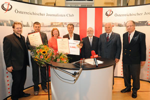Die Preisverleihung (v.r.): Oswald Klotz (ÖJC), LH Luis Durnwalder, Juryvorsitzender Fred Turnheim, Preisträger Zoran Dobric, ÖJC-Vizepräsidentin Christiane Laszlo, Andreas Zinggl, Richard Pyrker (ÖJC).
