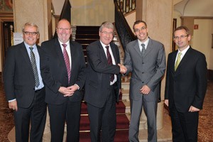 Mit Ferdinand Eberle, dem Präsidenten des Aufsichtsrats, dem Vorstandsvorsitzenden Bruno Wallnöfer sowie Vorstandsmitglied Alfred Fraidl konnte Landesrat Laimer heute die gesamte TIWAG-Spitze in Bozen begrüßen, mit Wolfram Sparber zudem den neuen SEL-Präsidenten. "Dieses Treffen unmittelbar nach der Einsetzung der neuen SEL-Spitze ist auch ein Zeichen der Verbundenheit zwischen den beiden Gesellschaften und den beiden Landesteilen", so Laimer heute.