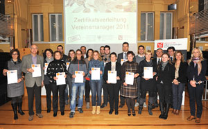 LPA - Nach dem erfolgreichen Abschluss des 2011 durchgeführten Zertifikatslehrgangs "Vereinsmanagement" konnten die 18 Teilnehmer heute (14. Dezember) nachmittag im Palais Widmann in Bozen im Rahmen einer kleinen Feierstunde ihre Zertifikate entgegennehmen.