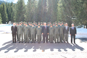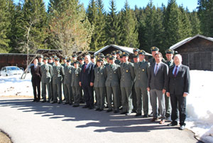 Bereit für ihren Dienst: Die 25 neuen Forstwachen mit Forstwirtschaftslandesrat Durnwalder (Mitte) , Ressortdirektor Holzer (ganz re.) und Abteilungsdirektor Profanter (2.v.re.) vor der Forstschule Latemar.