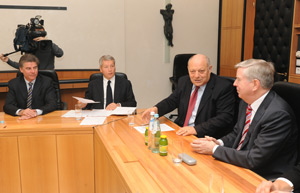 EU-Koordinator Cox, sein römisches Pendant Mauro Fabris, die BBT-SE-Vorstände Konrad Bergmeister und Raffaele Zurlo, RFI-Planungsdirektor Francesco Bocchimuzzo: Alles, was in Sachen BBT Rang und Namen hat, hat sich heute bei Landeshauptmann Durnwalder im Palais Widmann in Bozen eingefunden, um sich einen Überblick über die laufenden Arbeiten, die anstehenden Schritte und die Finanzierung des Ausbaus der Eisenbahnachse über den Brenner zu verschaffen. Die wichtigste Nachricht kam dabei von Pat Cox, der heute betonte, dass der Ausbau der Brennerachse in Brüssel weiterhin höchste Priorität genieße. Dieses Bekenntnis hat konkrete Folgen, stellte Cox doch in Aussicht, dass die EU nicht nur weiterhin einen entscheidenden Anteil an der Finanzierung des BBT übernehme, sondern diesen in den Jahren 2014 bis 2020 sogar noch steigere: "Die EU steht voll hinter diesem Projekt und intensiviert ihre finanzielle Beteiligung noch weiter", so Cox, der von einem Anteil von bis zu 40 Prozent der Kosten sprach.